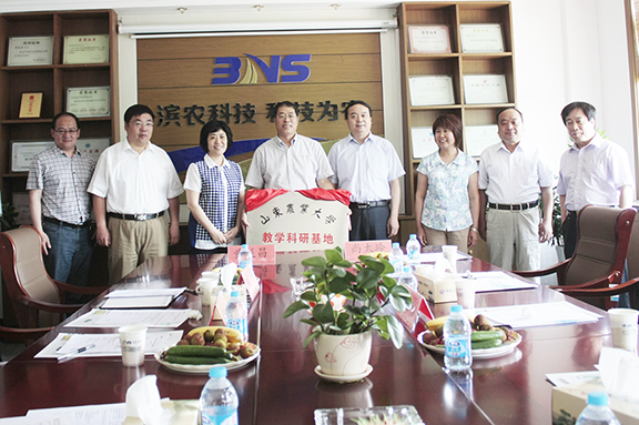 5月30日,濱農科技與山東農業大學獎學金合作暨教學科研基地揭牌儀式在我公司二樓會議室舉行。山東農業大學副校長車先禮、教務處副處長尚太玲、學工處副處長韓同吉、植保學院黨委書記董厚奎、植保學院副院長王金信、植保團委副書記王小東一行來我公司參觀交流并簽署合作協議。山農教務處副處長尚太玲、我公司董事長黃延昌分別代表雙方簽署合作協議,濱州市政協副主席、民建濱州市委主委吳國瑞為科研基地揭牌。