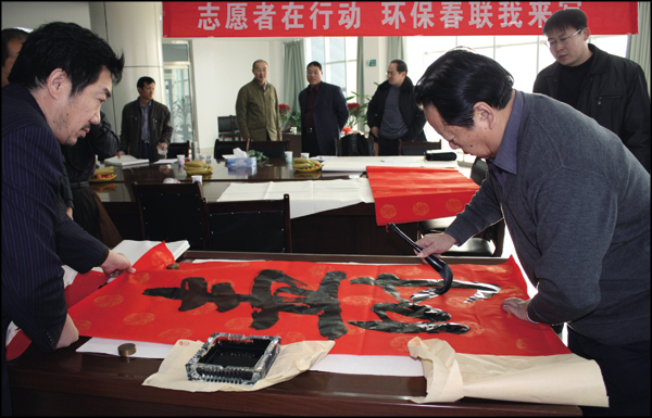1月29日上午,由濱州市環(huán)保局、環(huán)保協(xié)會(huì)聯(lián)合舉辦,我公司冠名贊助的環(huán)保春聯(lián)有獎(jiǎng)?wù)骷攥F(xiàn)場(chǎng)書(shū)寫(xiě)在我銷(xiāo)售公司三樓會(huì)議室隆重開(kāi)展。濱州市環(huán)保協(xié)會(huì)邀請(qǐng)我市書(shū)法協(xié)會(huì)主席孫樹(shù)勛先生等八位書(shū)法家,義務(wù)參加“志愿者在行動(dòng),環(huán)保春聯(lián)我來(lái)寫(xiě)”活動(dòng),現(xiàn)場(chǎng)潑墨揮毫,書(shū)寫(xiě)環(huán)保春聯(lián)一百多幅,墨香氤氳的和諧場(chǎng)面,暗合了“青山環(huán)北郭,綠水繞東城”的美好和諧意境。